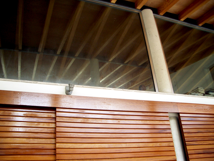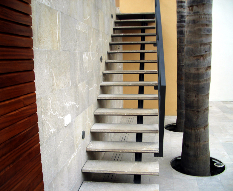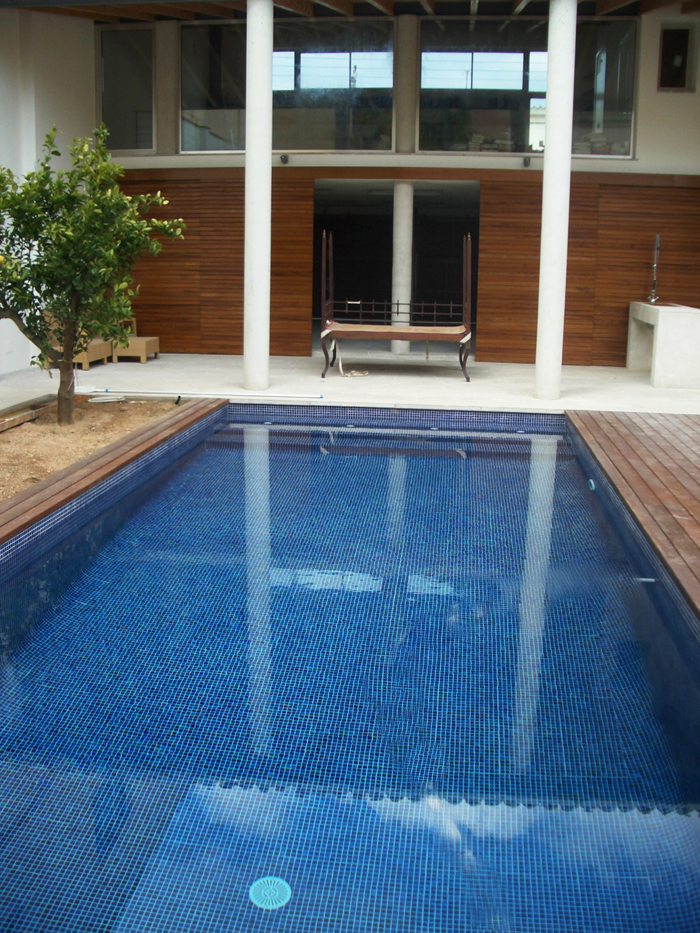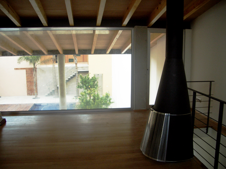 Como complemento a una vivienda existente, y en su parte posterior donde antiguamente había una nave-almacén industrial, se define este estudio y jardín con piscina. La construcción en dos alturas, prolonga su cubierta inclinada hacia el jardín interior formándose un porche de gran altura como fachada, complemento y nexo con el espacio interior ajardinado entre el estudio y la vivienda. La fachada del estudio a la calle posterior, con huecos mínimos y de carácter más hermético, se contrapone a la fachada hacia el patio, abierta y ligera.