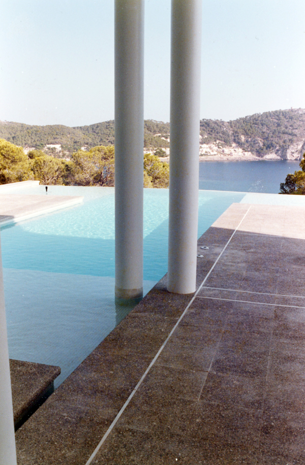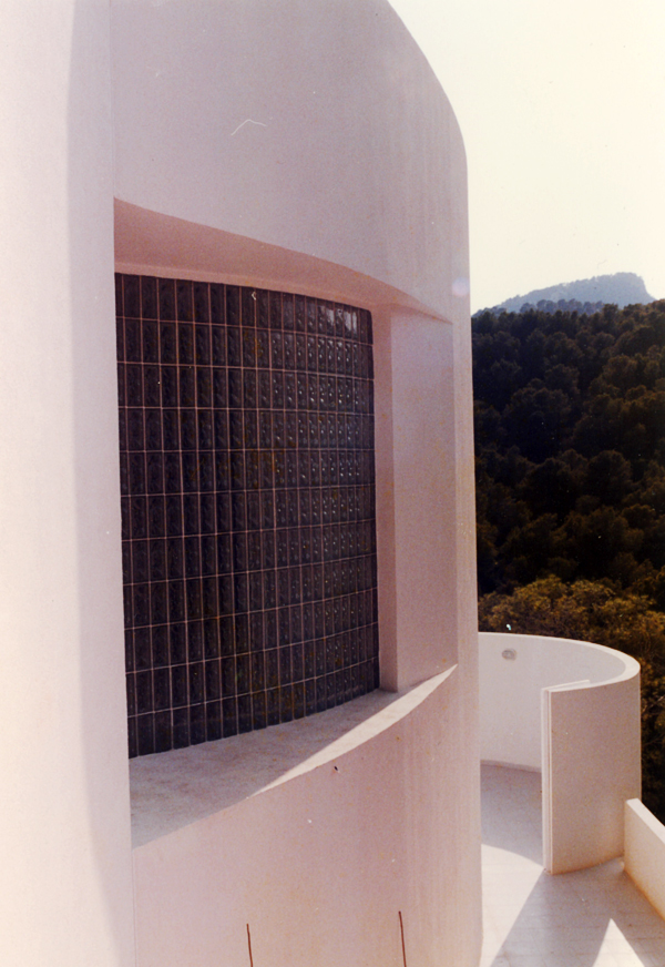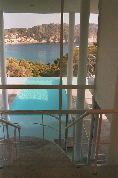 Situada en la ladera de una montaña, con vistas hacia el mar. El acceso se produce por la parte posterior, desde la planta superior de dormitorios, en cuya parte central se sitúa la entrada-vestíbulo con doble altura y escalera hacia la planta inferior. El espacio de vestíbulo se abre frontalmente al exterior, con visual dirigida hacia el mar acompañada por el eje del plano de agua de la piscina con intencionada continuidad. Un pórtico de doble altura y esbeltos pilares recorre la fachada principal, como filtro y elemento protector, dando a la casa un carácter aúlico y de mayor escala. El carácter abierto, ligero y transparente de esta fachada, se contrapone con los volúmenes opacos y herméticos de la posterior.