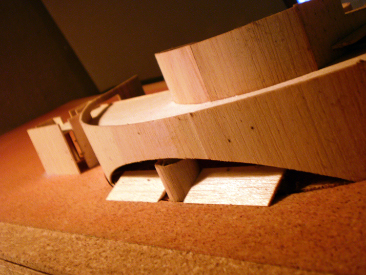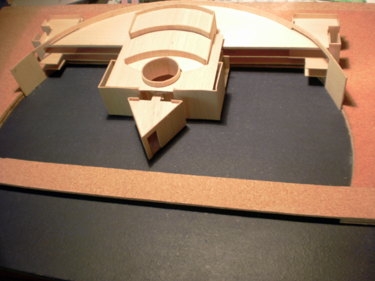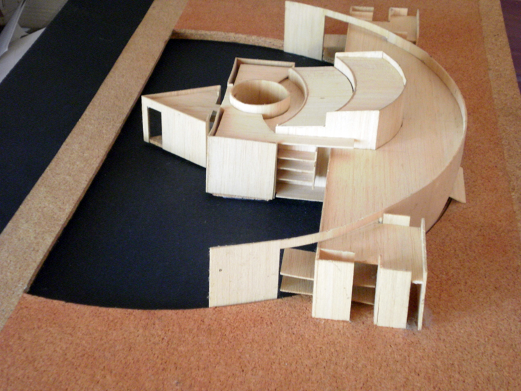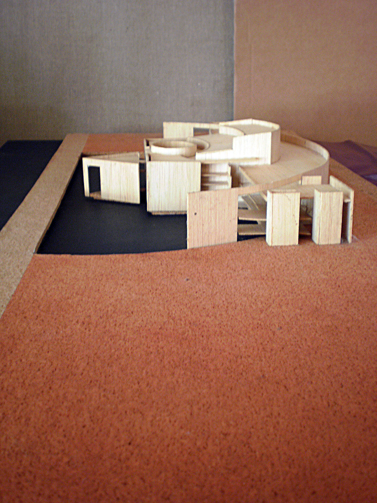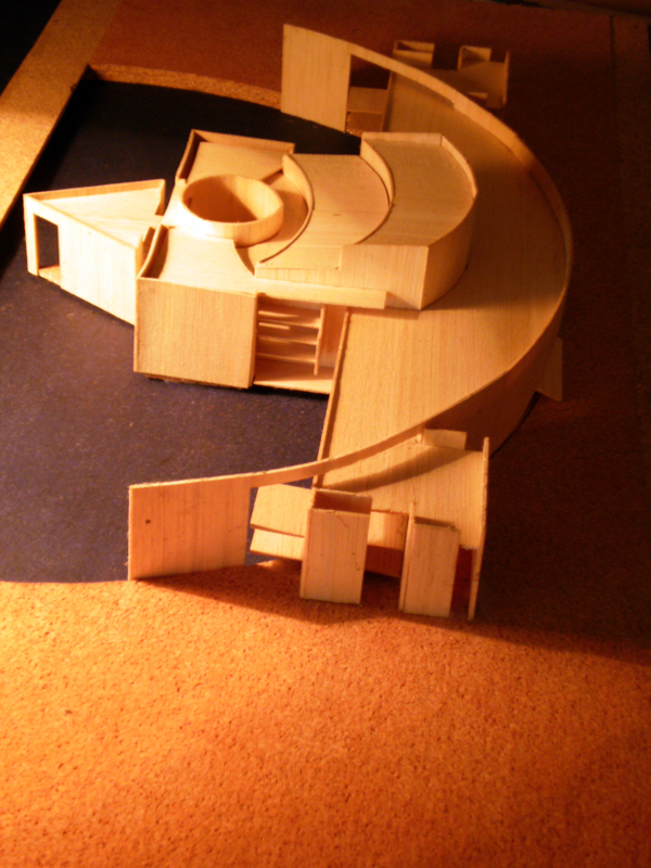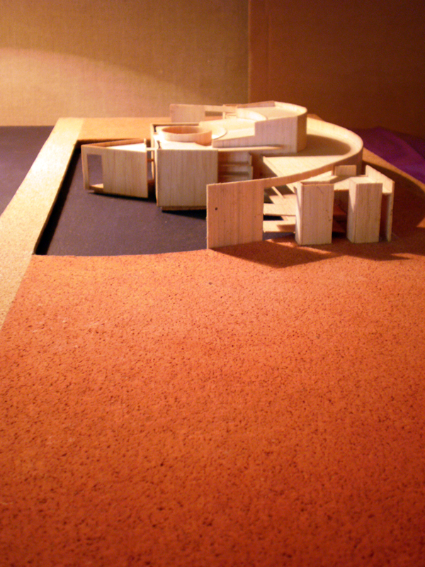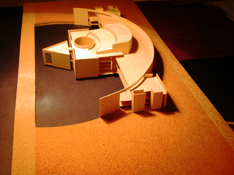 Propuesta para la definición de un edificio singular en el borde marítimo, con funciones de auditorio en la ciudad de Málaga. De volumetría simétrica, la planta de distribución acompaña el semicírculo definido con entrada de agua del mar. Al plano de agua se abren visualmente las zonas auxiliares y de relación ( vestíbulo, cafeterías, salas de ensayos… ), y en el centro de la misma se implanta el volumen principal de la sala de conciertos con posibilidad de entrada de luz natural sobre el escenario a través de lucernario circular.