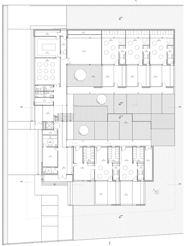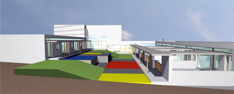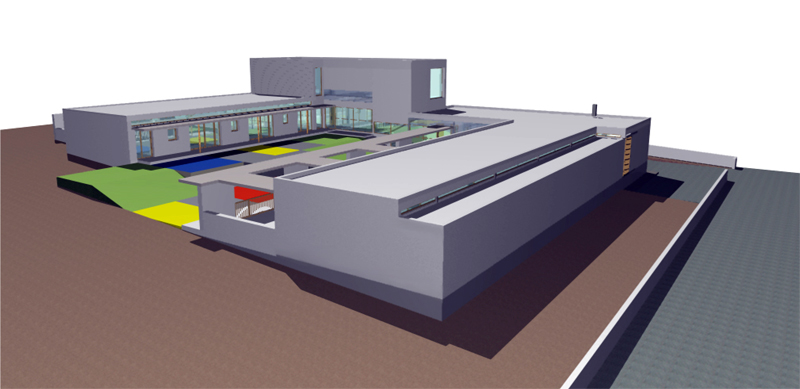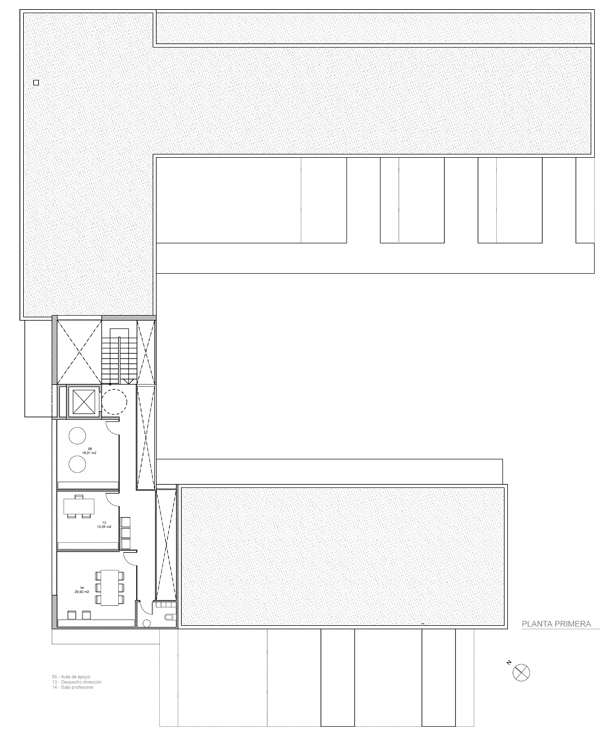 Proyecto de escuela infantil en un área de crecimiento de la trama urbana de la ciudad. El edificio se desarrolla en una planta baja a dos niveles siguiendo la pendiente del terreno donde se sitúan las aulas, comedor y espacios de actividades de los niños y una planta superior en la que se ubican las zonas de dirección y profesorado. Ambas plantas unidas por un espacio de doble altura como vestíbulo y zona de relación de los tres niveles. Cada una de las 6 aulas, dispone de su propio espacio o aula exterior anexa. Los tres lados de la planta general definen el patio común exterior abierto hacia el sur, donde se desarrollan las actividades de juego y recreo y hacia donde se abren la mayoría de espacios del edificio.