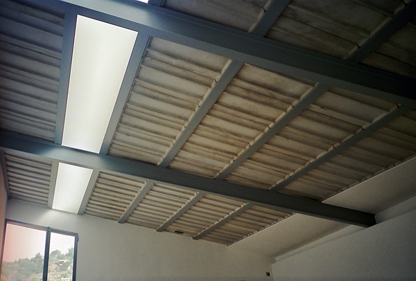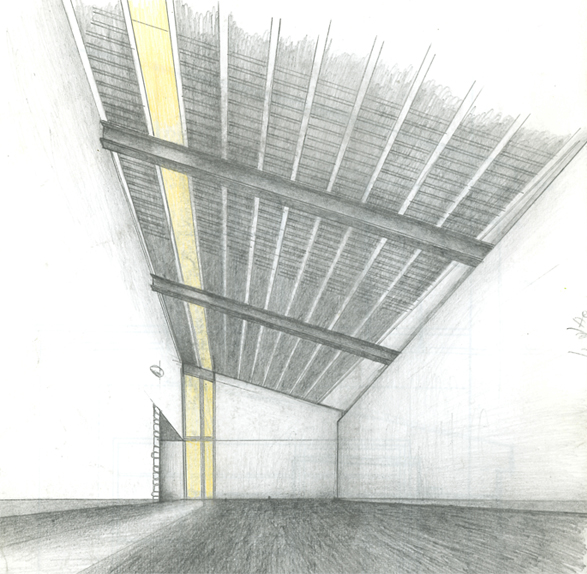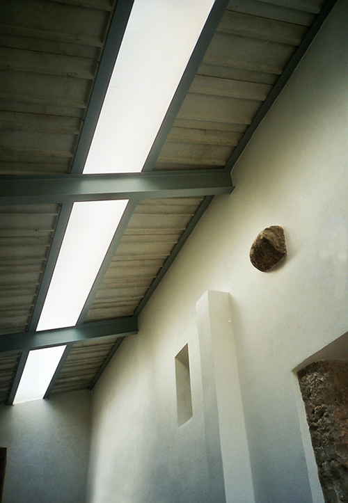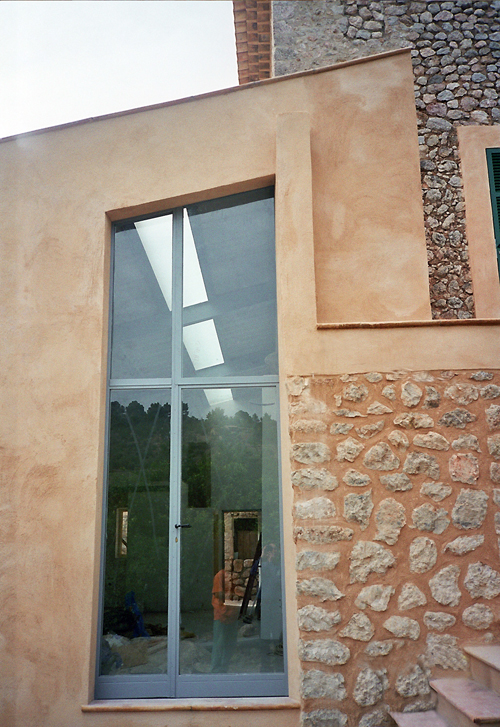 Estudio adosado como ampliación y reforma de la vivienda del pintor M.A.Campano en el valle de Sóller. Un volumen de planta rectangular con cubierta inclinada, con interior neutro y una importante entrada de luz cenital a través de un lucernario en el eje longitudinal del espacio. Interior con materiales y acabados industriales y exterior en diálogo en escala y tipología con la vivienda existente de carácter tradicional.