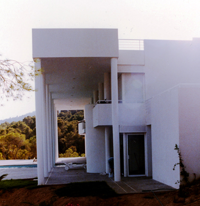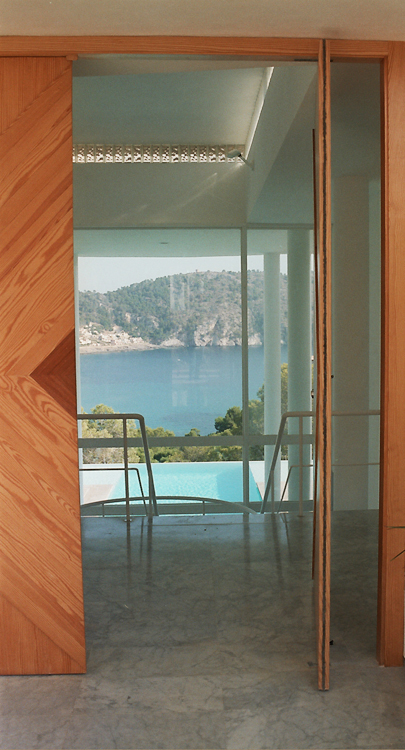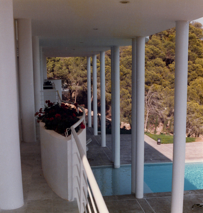 Situada en la ladera de una montaña, con vistas hacia el mar. El acceso se produce por la parte posterior, desde la planta superior de dormitorios, en cuya parte central se sitúa la entrada-vestíbulo con doble altura y escalera hacia la planta inferior. El espacio de vestíbulo se abre frontalmente al exterior, con visual dirigida hacia el mar acompañada por el eje del plano de agua de la piscina con intencionada continuidad. Un pórtico de doble altura y esbeltos pilares recorre la fachada principal, como filtro y elemento protector, dando a la casa un carácter aúlico y de mayor escala. El carácter abierto, ligero y transparente de esta fachada, se contrapone con los volúmenes opacos y herméticos de la posterior.