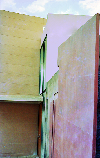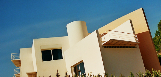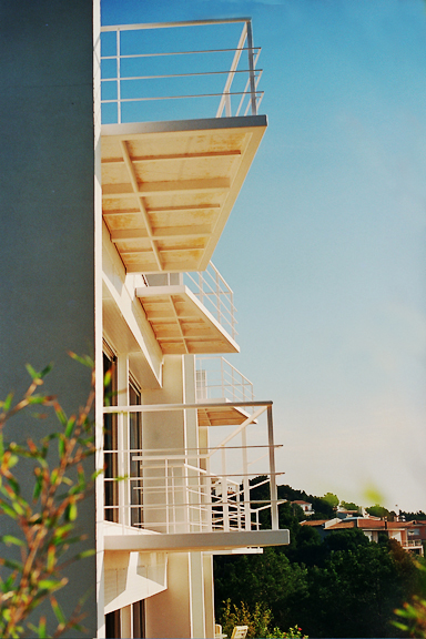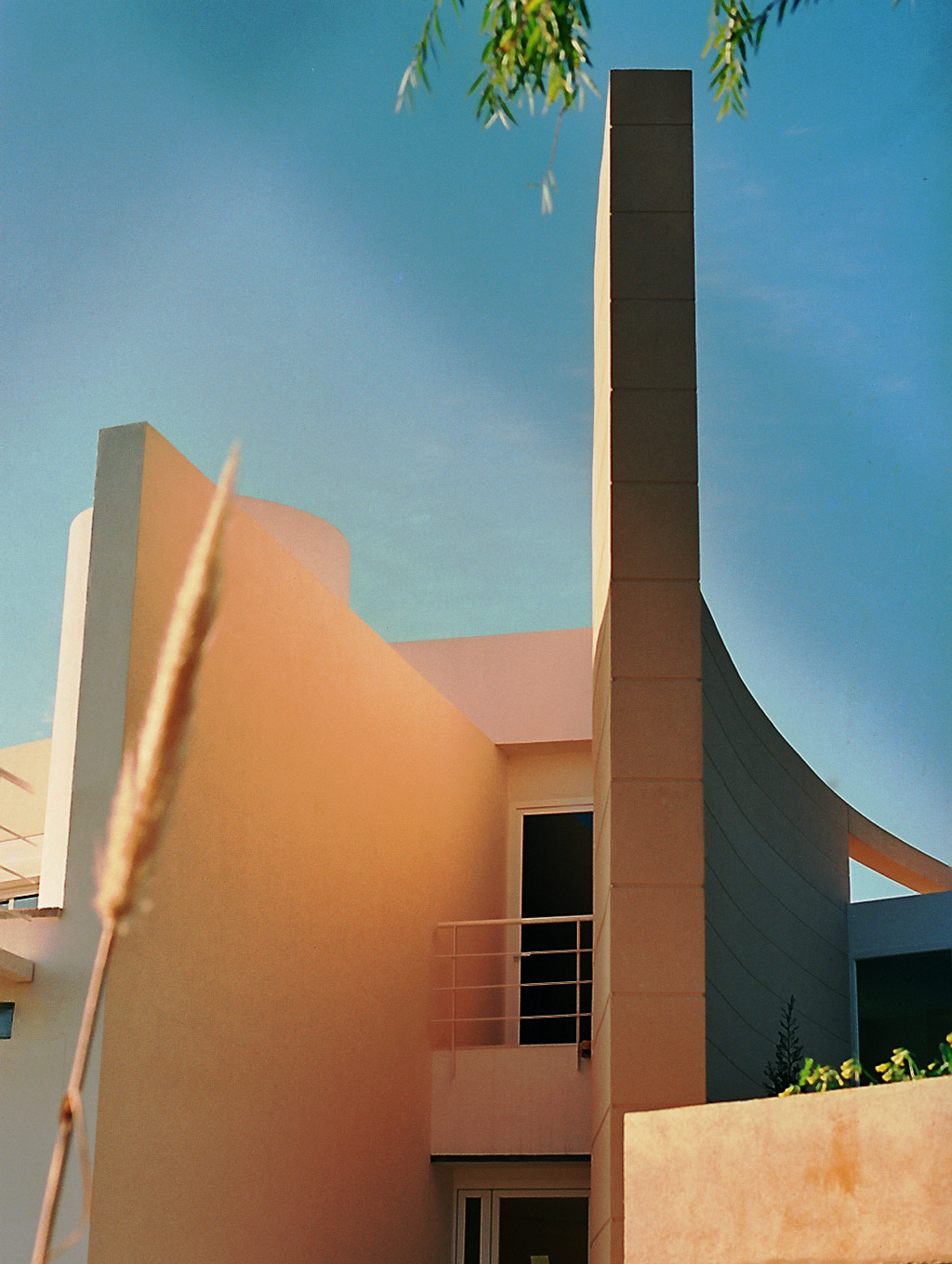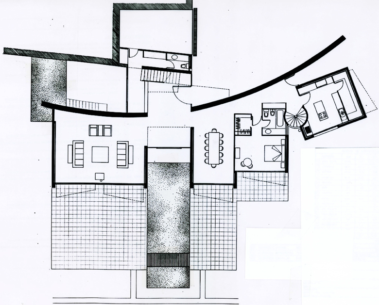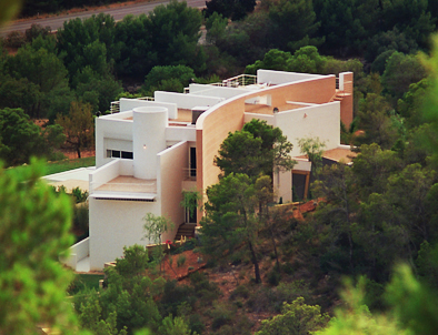 Situada en la ladera de una colina frente al mar ; La vivienda, por su estructura y composición, destaca como hito en el paisaje y dentro del medio natural que a la vez definió su configuración. Con un esquema muy claro y rotundo, un gran muro curvo paralelo a las líneas de nivel de la montaña como espalda de la casa y frontera entre la vivienda y el bosque, y una serie de muros blancos paralelos, en dirección al mar y abrazados por la gran curva. La entrada a la casa se produce desde atrás, desde el bosque y atravesando la línea curva que marca el límite entre lo salvaje y lo doméstico, entre la tierra y el mar. El mar enfocado por los “contrafuertes” blancos y el plano de la piscina,que saliendo del edificio dirige la mirada hacia el horizonte. En la fachada, como esculturas colgadas, los elementos metálicos con doble función de balcón-brisolei de planta trapezoidal creando un juego de perspectivas y movimientos, según la incidencia de la luz solar y el enfoque de la mirada del espectador hacia ellos. Obra seleccionada para publicación y exposición de ETSAN ( Universidad de Navarra).