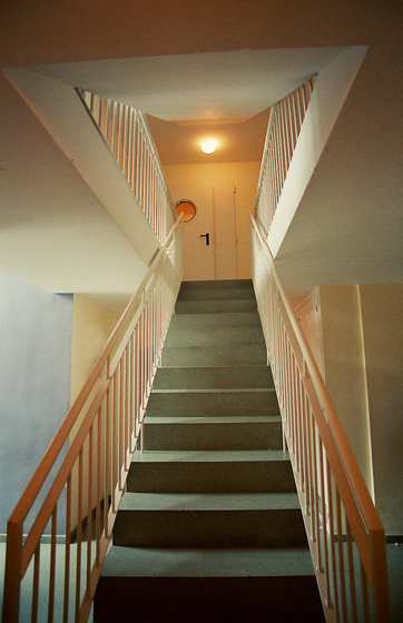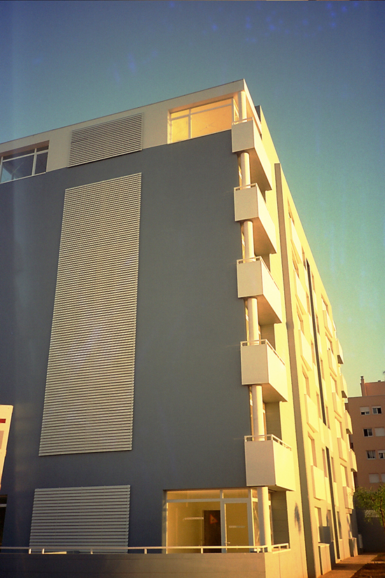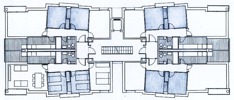 Un volumen de 6 alturas en el que se desarrollan 24 viviendas sociales. Con 4 viviendas dispuestas simétricamente en planta y un eje vertical central de comunicación.